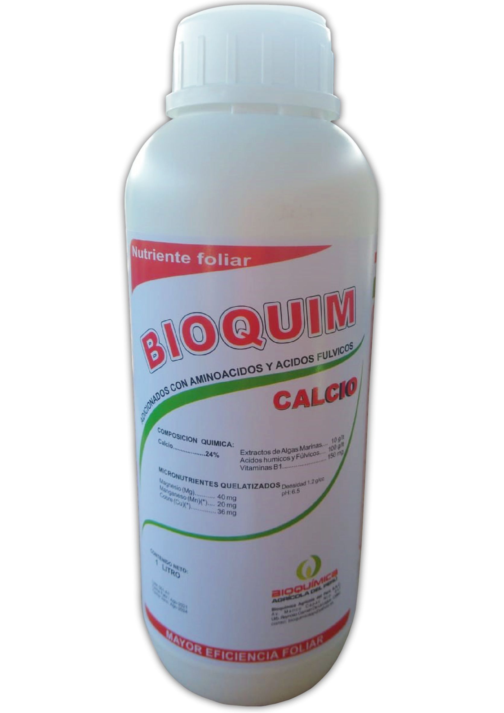 BIOQUIM CALCIO es un fertilizante líquido que contiene Calcio, micronutrientes quelatizados, ácidos húmicos y fúlvicos, además, contiene extractos de algas, logrando que los nutrientes minerales sean rápidamente asimilados y con mayor aporte de energía para la planta.DETALLES DEL PRODUCTO
