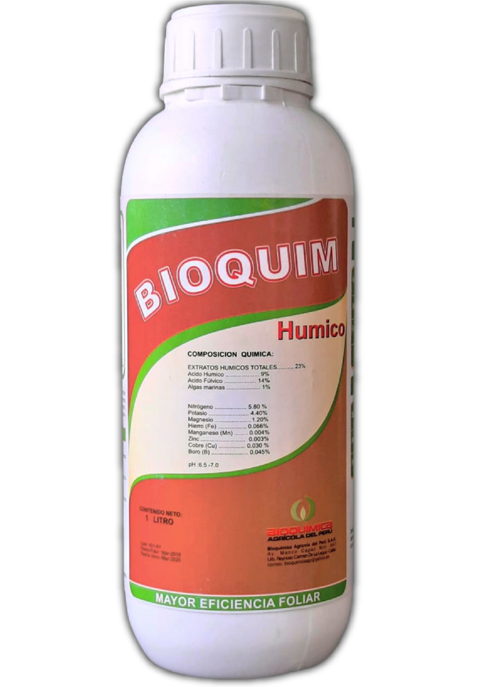 BIOQUIM HÚMICO es un fertilizante líquido que contiene Ácidos Húmicos, Fúlvicos, Nitrógeno, Potasio y micronutrientes en forma balanceada para aplicación foliar y aplicaciones en drench, incrementa la asimilación de nutrientes por las raíces, además, ayuda a potenciar las aplicaciones foliares de agroquímicos en general.DETALLES DEL PRODUCTO