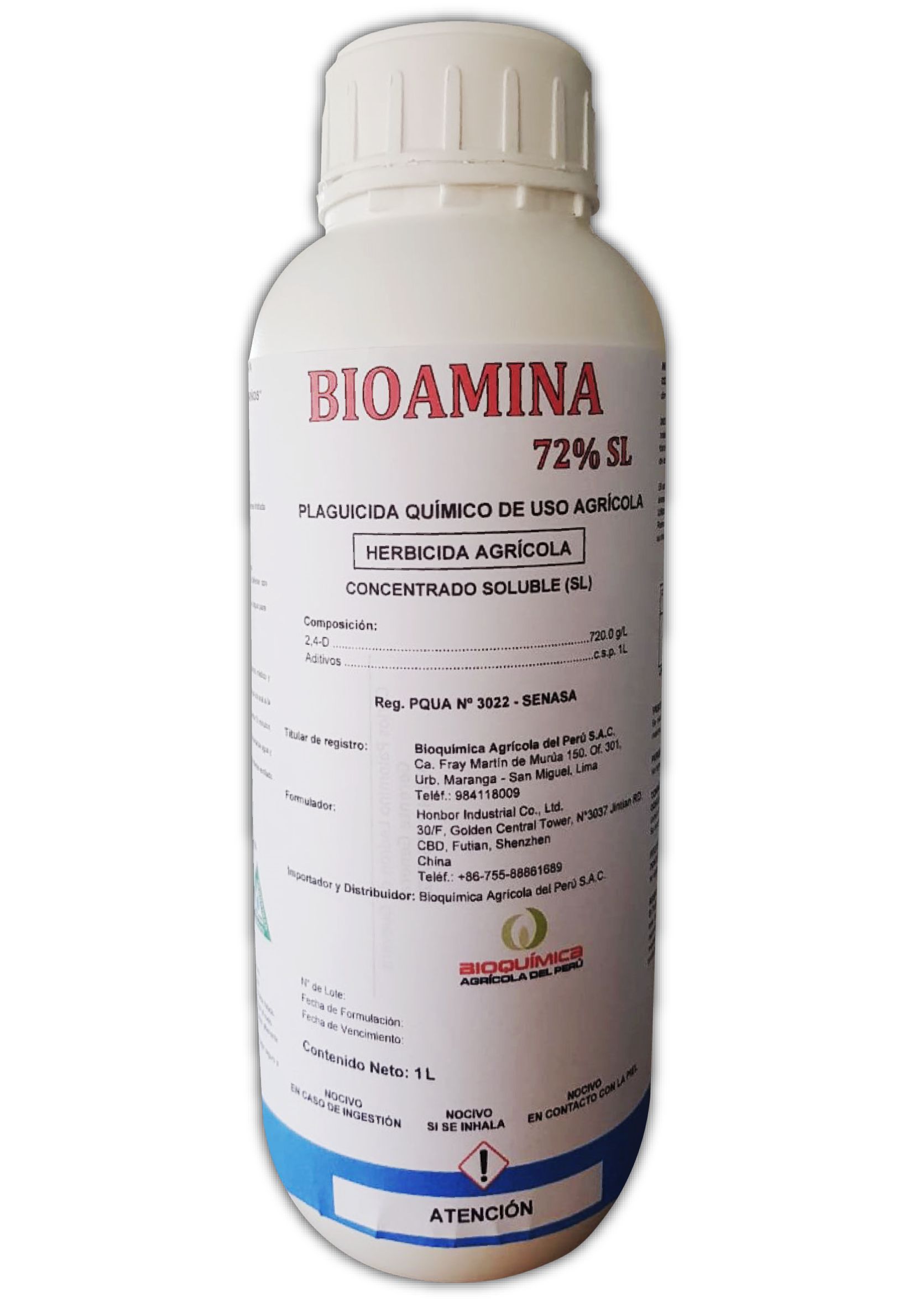 BIOAMINA 72% SL es un herbicida que tiene como ingrediente activo a la sal dimetilamina del 2,4-D.BIOAMINA 72% SL es un herbicida post-emergente selectivo para el control de las malezas de hoja ancha, es de acción sistémica que se absorbe por el follaje y raíces. Es translocado en la planta por el floema y el xilema, acumulándose en las regiones meristemáticas de los rebrotes y raíces.