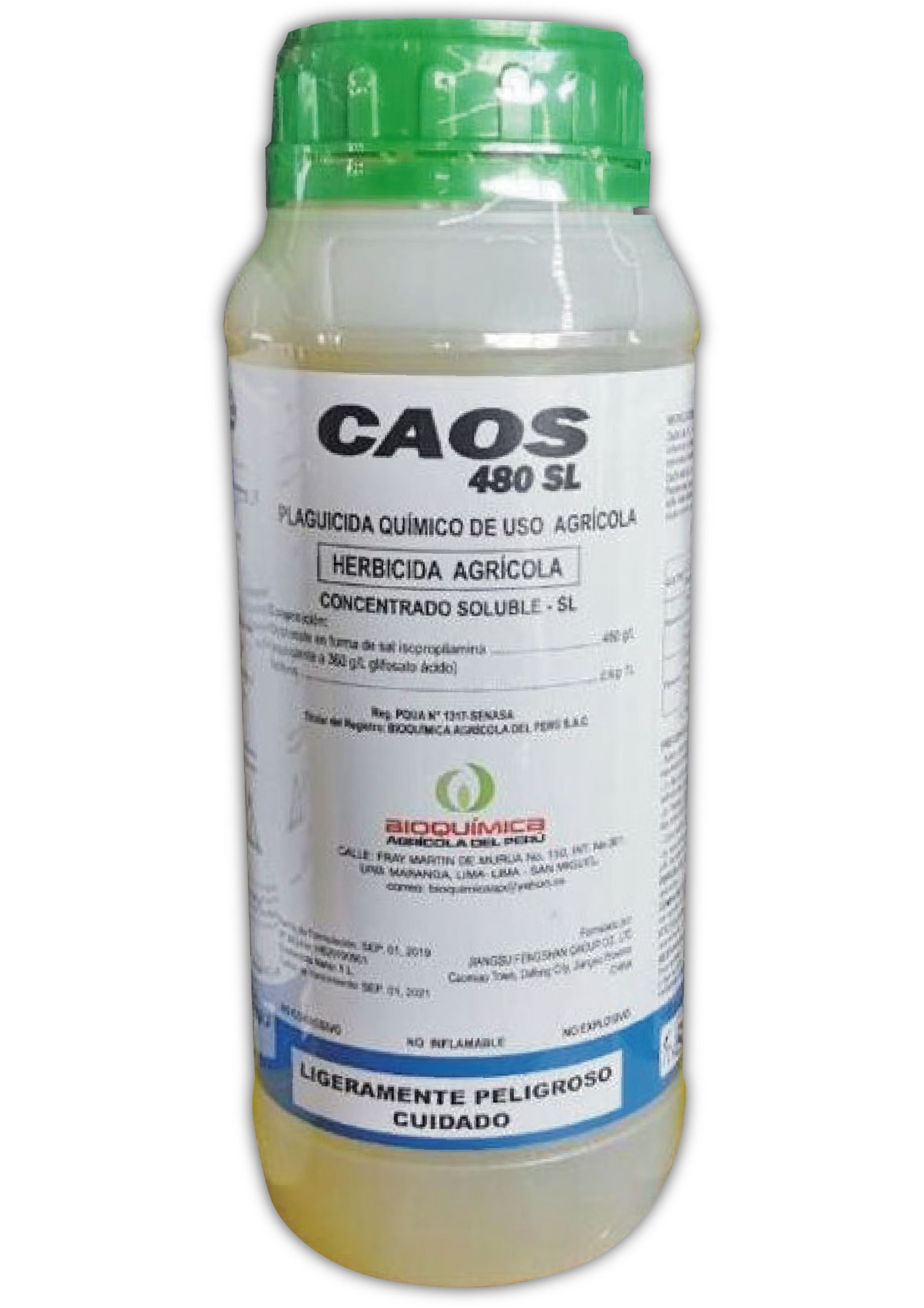 CAOS 480 SL es un herbicida no selectivo a base de glifosato que se aplica directamente al follaje. Luego de la aplicación de CAOS 480 SL a las malezas, este es capaz de moverse al interior de toda la planta. La aplicación de CAOS 480 SL debe realizarse cuando la maleza muestra post emergencia temprana.DETALLES DEL PRODUCTO