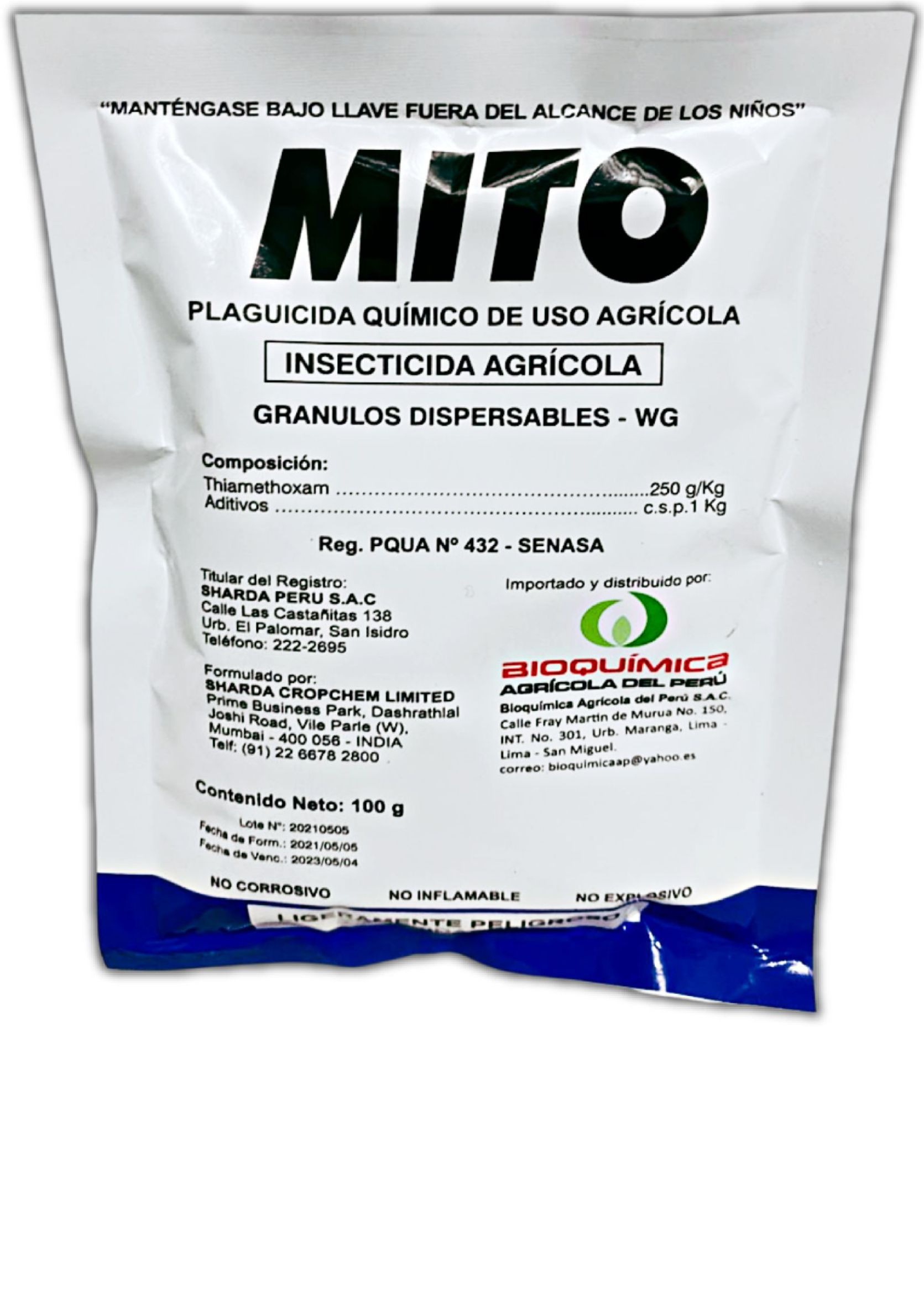 MITO es un insecticida altamente sistémico y translaminar que actúa por contacto e ingestión contra insectos picadores chupadores y raspadores de hojas. Es asimilado rápidamente por la planta y transportado en forma acropétala por el xilema. Causa un bloqueo irreversible de los receptores postsinápticos de acetilcolina nicotínicos interfiriendo el sistema nervioso central del insecto ocasionándole la muerte.DETALLES DEL PRODUCTO